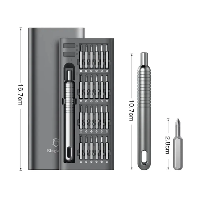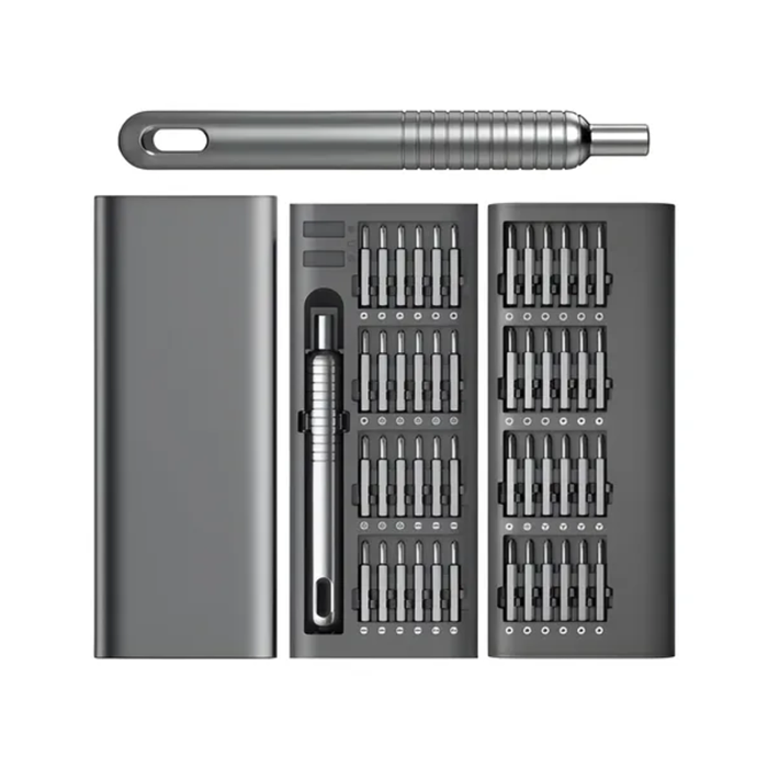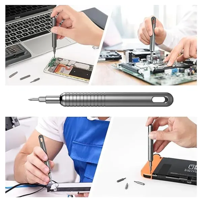 El set incluye un destornillador de precisión con mango ergonómico, que garantiza un agarre firme y un control total durante las tareas más delicadas. Su diseño moderno y su acabado gris elegante lo convierten en una herramienta práctica y estética, ideal tanto para aficionados como para técnicos especializados.