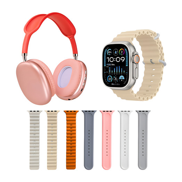 Incluye 1 smartwatch con 7 mallas intercambiables y auriculares Bluetooth.