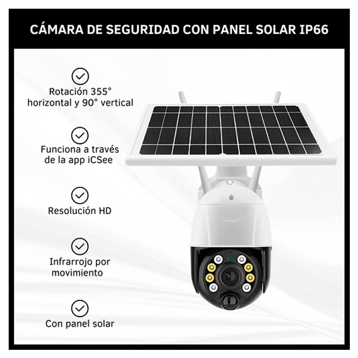 La Cámara de Seguridad con Panel Solar HD Wi-Fi IP66 Domo Exterior es ideal para quienes buscan una vigilancia potente, ecológica y sin mantenimiento. Fácil de instalar, resistente y totalmente inalámbrica, ofrece tranquilidad y control total desde tu celular.