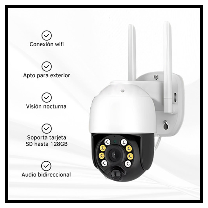 La cámara ofrece video en calidad HD con visión nocturna automática e infrarrojo por movimiento, garantizando imágenes nítidas tanto de día como de noche. Además, su audio bidireccional permite comunicarte en tiempo real desde tu celular, ideal para hablar con visitantes, empleados o familiares.